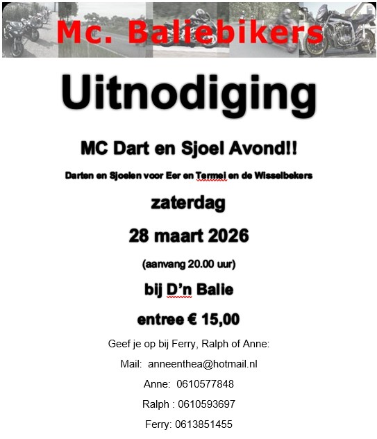 Beste Baliebikers. 28 maart 2026 worden weer de MC Dart en Sjoel kampioenschappen gehouden in D’n Balie. Ook dit keer wordt er weer plek gecreëerd in
