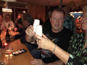 Op een gegeven moment werd het tijd voor sommige om een eind aan de avond te maken. Waaronder Cor. Cor was helaas zijn fietssleutels kwijt en heeft de fiets maar op zijn nek meegenomen naar huis en in zijn schuur gebroederlijk geparkeerd naast …… zijn eigen fiets! Cor was namelijk lopend gekomen. Wim daarentegen was met de fiets gekomen en moest lopend naar huis. Wims fiets is 2 druppels water met die van Cor. En overigens ook met die van mij, dus ik heb geluk dat het altijd Wim is waarvan de spullen door de clubhuisdieven worden meegenomen. Dat is Wim namelijk al meerdere keren overkomen. Dus die van mij stond er nog.