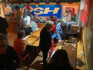 Zaterdag 10 februari werd de jaarlijkse Dart-Sjoel avond gehouden. Het werd een grote opkomst, zeker gezien de ruimte die nodig was voor de opstelling van de dart-court en de sjoel-court. Uiteindelijk met zijn 30-en. 7 darters, 15 sjoelers, 6 meelevers en 2 sfeerproevers. Hennie en Ingrid maakten na de sfeer geproefd te hebben rechtsomkeert. Vanwege geen zitplaatsen ???