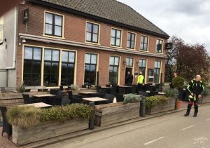 De route liep in eerste instantie langs de Giessen, mooi maar allemaal smalle weggetjes en dus vrij langzaam. Iets wat bij mij goed past op de motor. Patrick zag ik voor mij steeds vaker heen en weer schuiven en Anne en ik dachten dat hij het te langzaam vond gaan toen hij bij Gorinchem afscheid nam en de snelweg pakte. Later bleek dat hij het gewoon koud had, onder meer door een kater. Na Gorinchem was er meer ruimte en werd er vlotter gereden. Het weer bleef best goed op een piepklein hagelbuitje na. Halverwege de rit werd het uiteraard tijd voor koffie/thee en appeltaart met slagroom. Dit werd appelcake en dat smaakte goed. De snelle groep wachtte ons buiten op bij Brouwerij Het dijkhuis. Zeer sympathiek, of waren ze er pas net?